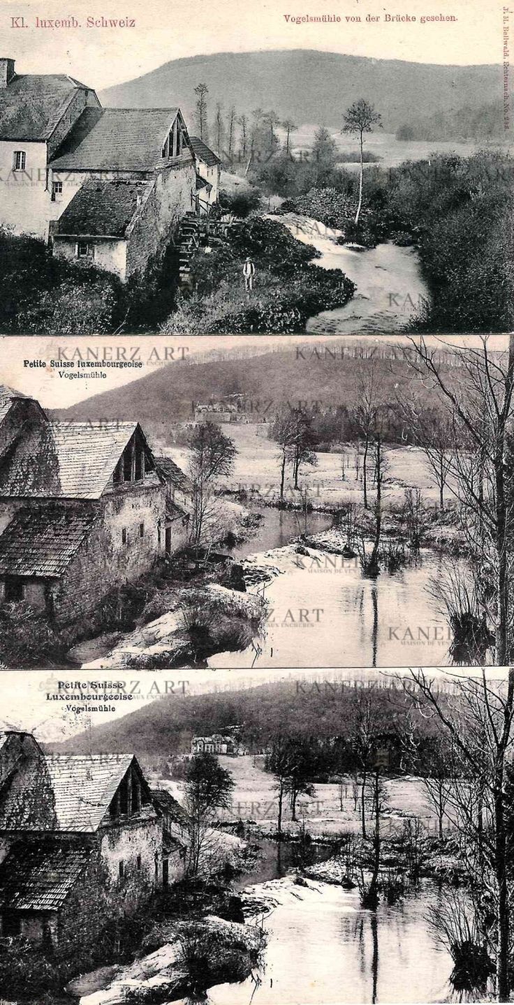 MULLERTHAL . 1. Vogelsmühle von der Brücke gesehen, J.M. Bellwald, No. 288, 1907, 2. 2 x Vogelsmühle, J.M. Bellwald, No. 280, ca. 1910, chez une le timbre a été retiré (De la collection Norbert HANSEN)