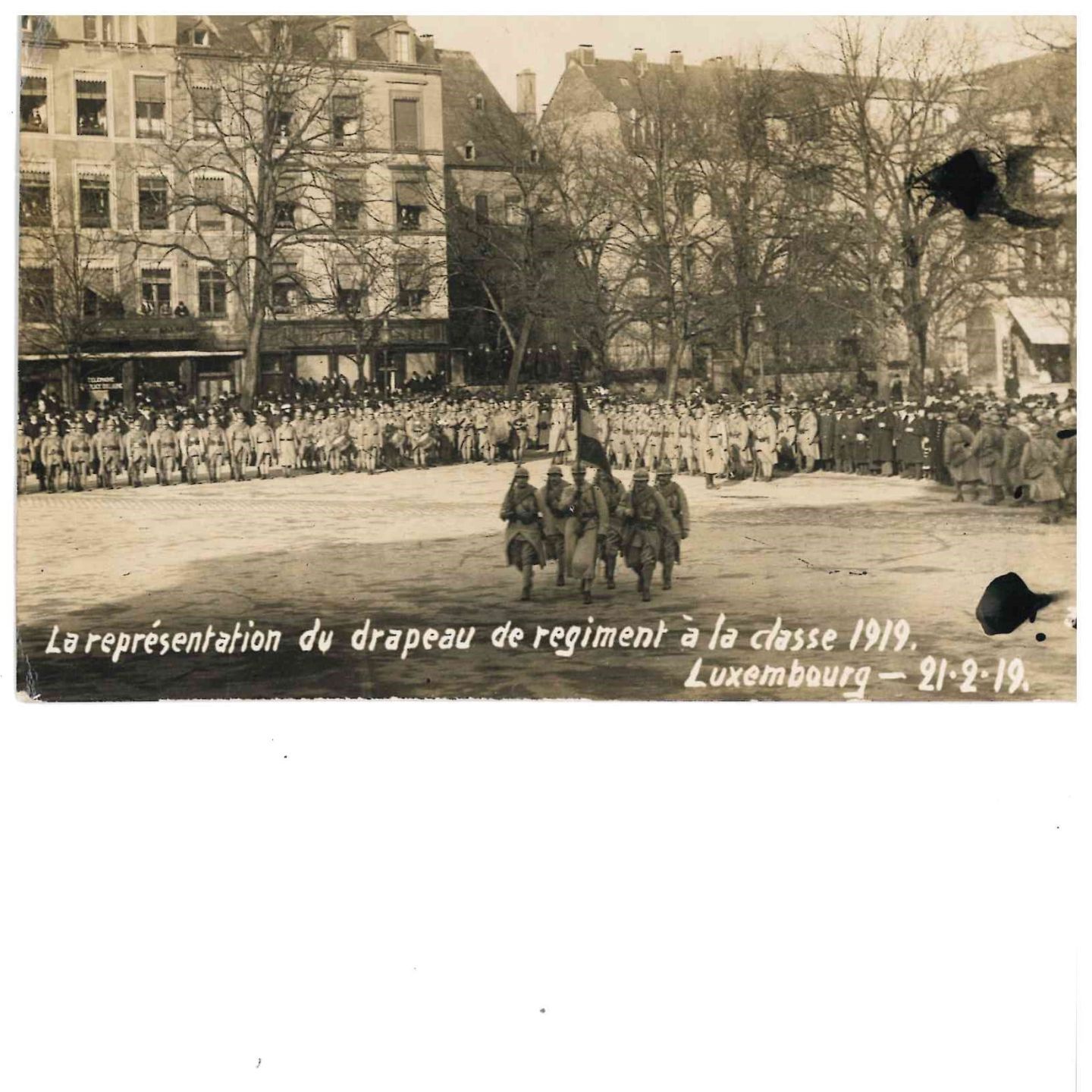 WAR I. Carte photo représentation du drapeau de régiment à la classe 1919 Luxembourg 21,2,19 ,