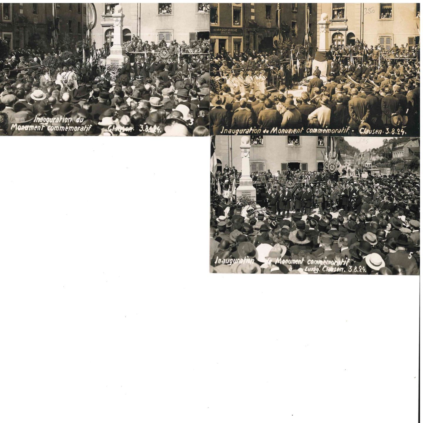 WAR I. 3 cartes photo de l'Inauguration de Monument Commémoratif à Clausen le 3.8.24