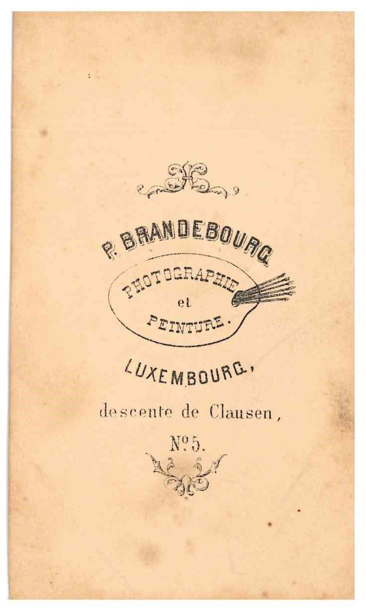 BRANDEBOURG. Photographie format carte de viste d'une jeune femme par le photographe P. Brandebourg à Luxembourg, 5 descente de Clausen. Coin corné.