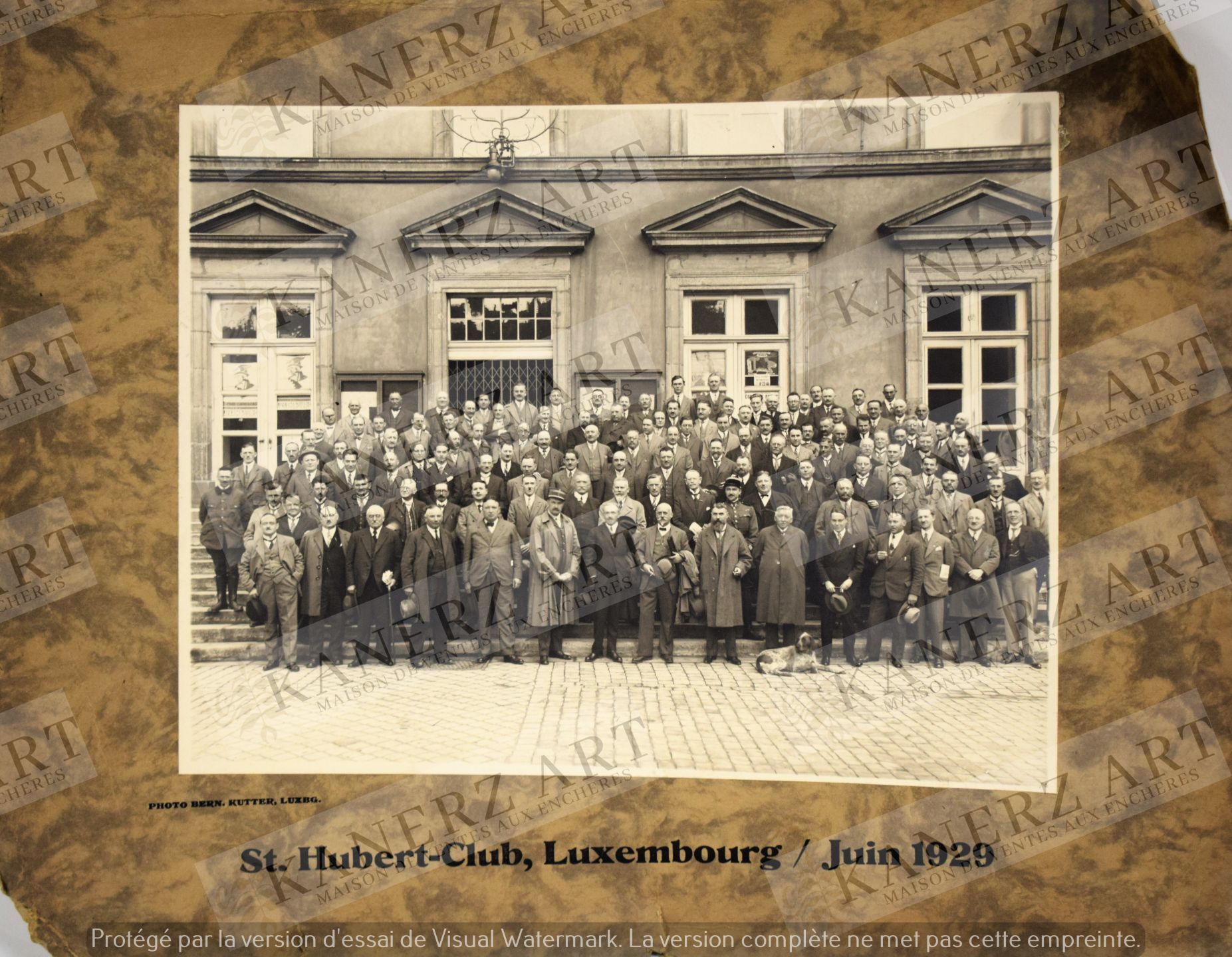 CHASSE. Grande photographie contrecollée sur carton fort du Saint HUBERT-Club, Luxembourg, Juin 1929. Par le photographe Bernard KUTTER. 22,5 x 29 cm