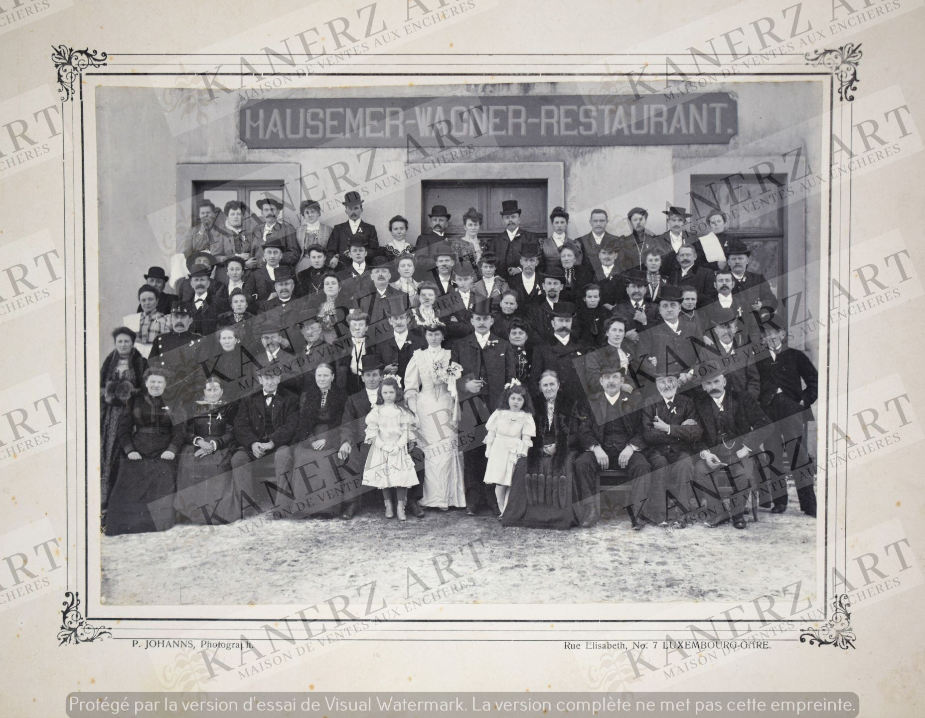 MARIAGE. Grande photographie contrecollée sur carton fort d'un mariage bourgeois devant le Restaurant HAUSEMER-WAGNER, par le photographe P. JOHANNS à Luxembourg, vers 1900.