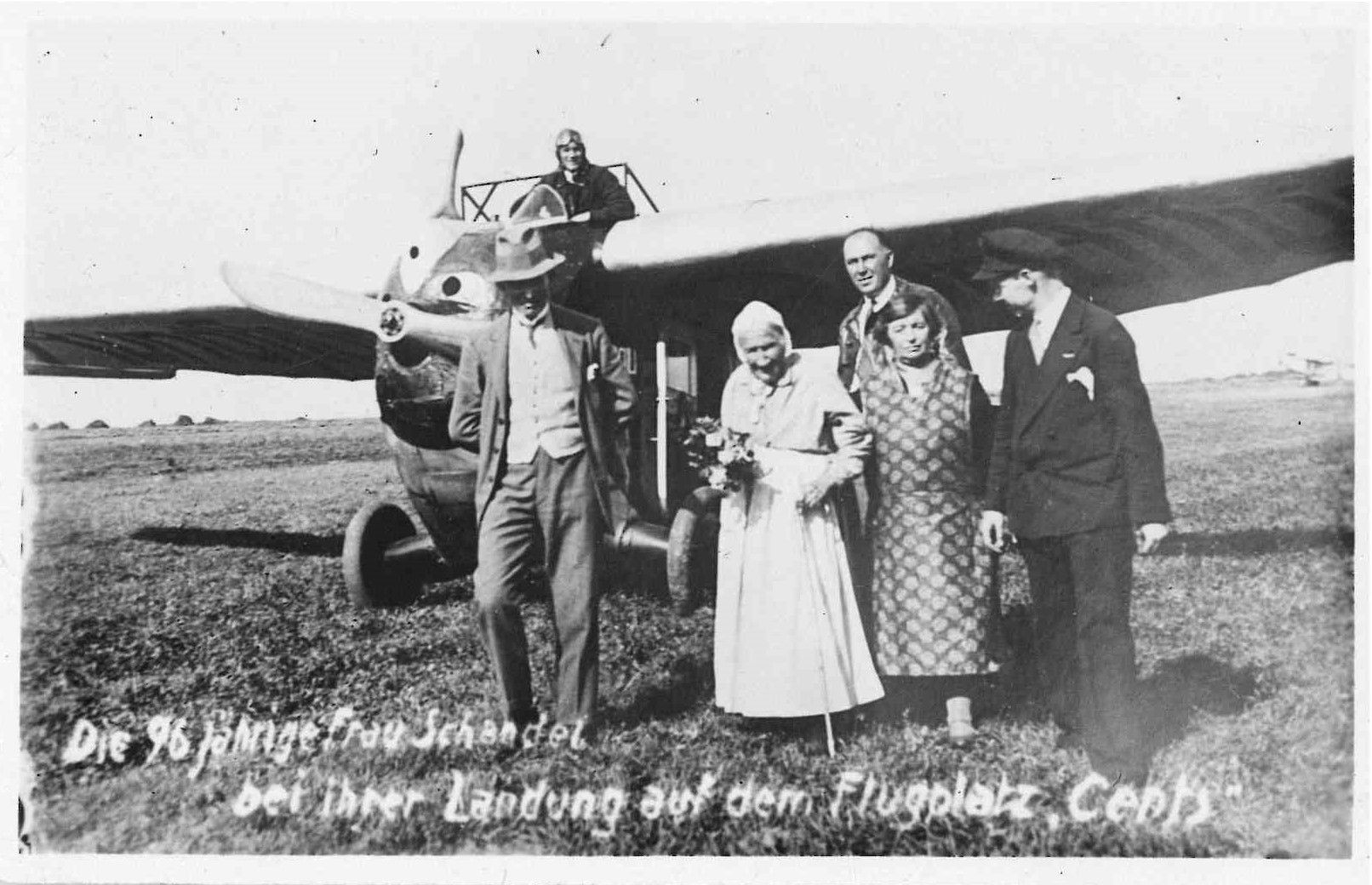 AVIATION. Très rare photographie du vol de Frau Schandel pour ses 96 ans, atterrissage au Cents, le 26 août 1930.