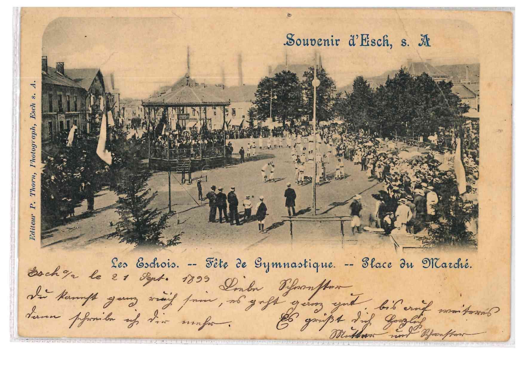 ESCH. Carte postale "Souvenir d'Esch" : Les eschois -- Fête de Gymnastique -- Place du Marché. Editeur P. Thorn, Esch/Alzette, 1899.