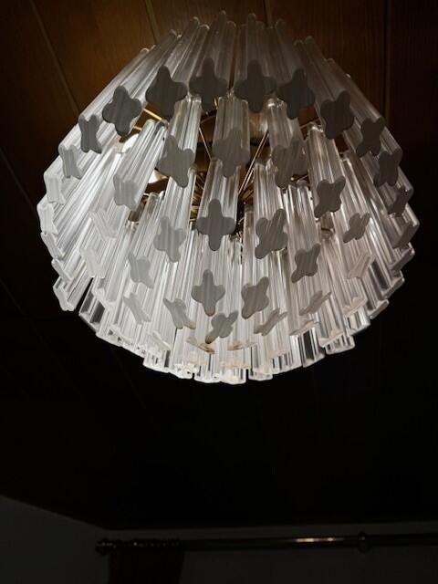 J.T. KALMAR. Lustre suspendu à 4 feux. Verre transparent et laiton doré. Autriche, 1970. Hauteur : 60 cm