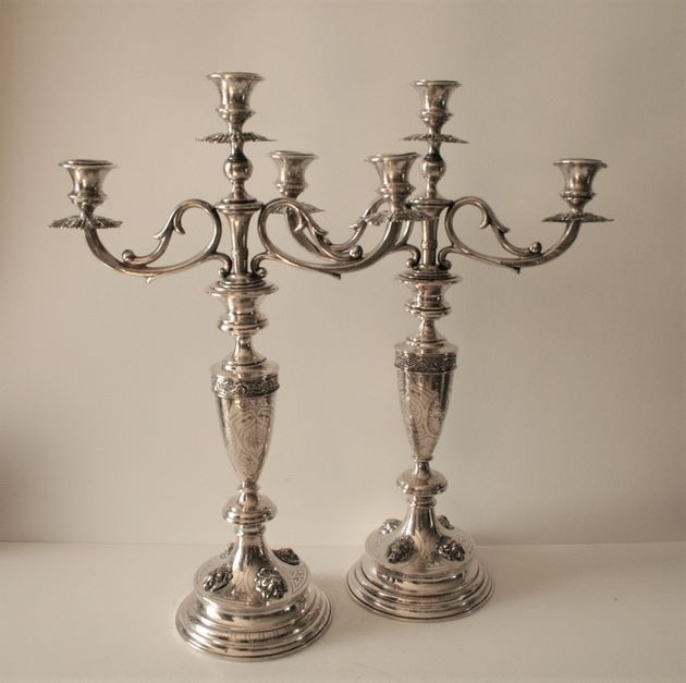 Paire de candélabres en argent, pied décoré de mufles de lions, fût ciselé de fleurs et de rinceaux, 3 lumières reposant sur bobèche démontable, poinçons autrichiens - Hauteur : 49 cm, Poids : 1252 g
