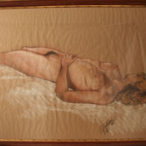 Diane FISCHBACH (née en 1959), artiste luxembourgeoise, Dessin rehaussé à la craie : Nu allongé, signé et daté 94 - Dimensions : 80 x 109 cm