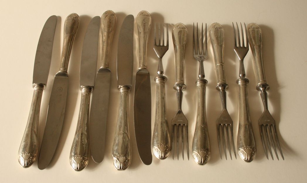 Ensemble de 24 couverts aux manches en argent 800 aux motifs art déco : 6 grandes fourchettes (76,7 g), 6 grands couteaux (88,9 g), 6 petites fourchettes (44 g) et 6 petits couteaux (47,4 g) - Poids brut : 1542 g