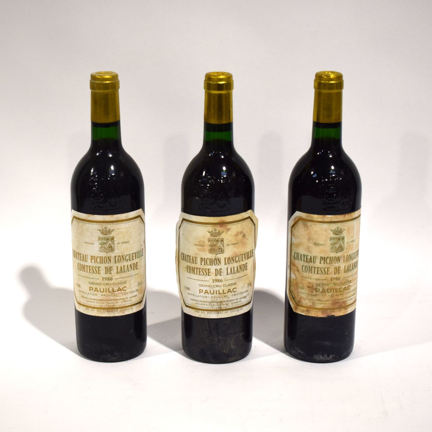 Lot de 3 bouteilles du Château Pichon Longueville Comtesse de Lalande 1986, conditions d'étiquettes variées