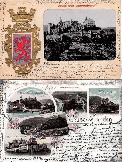Ensemble de 2 cartes postales de 1901 "GRUSS aus VIANDEN", l'une ornée des armes du pays et une photographie , l'autre à 5 vignettes (ancienne collection ABENS)