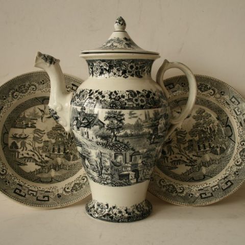 Réunion de deux assiettes L. LAMORT Echternach joint une cruche de la même maison, milieu XIXe siècle, petit éclat sur une des assiettes