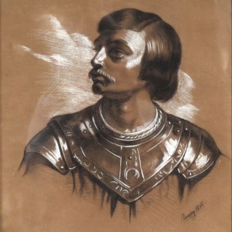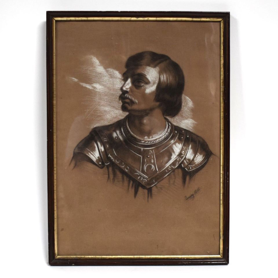 Ch. BASSING, Buste de gentilhomme en spallière, Dessin au fusain et rehaut de craie, Provenance familiale. L'artiste s'est inspiré des chevaliers de Vianden d'où sont originaires les Bassing, ca 1870/1880. Bel état, 45 x 31 cm