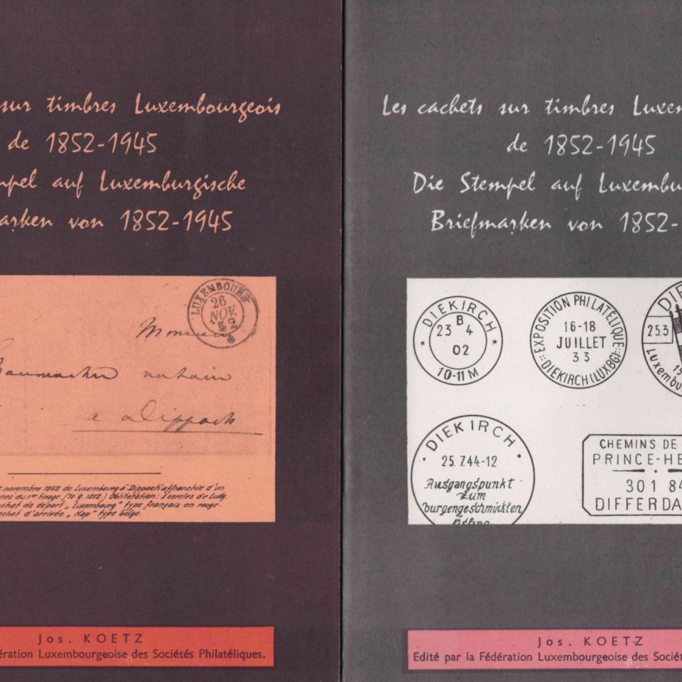 Jos. KOETZ : Les cachets sur timbres luxembourgeois de 1852-1945, ca 1970, volume de texte et volume d'illustrations
