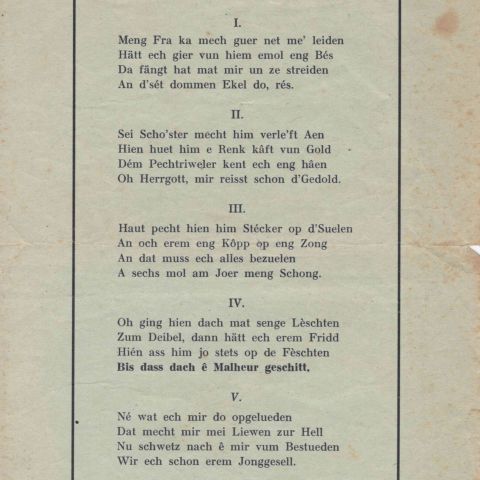 Charles BLOCK : Melodie vum "Wilddieb", paroles, Luja-Beffort Luxembourg, 21 x 15 cm