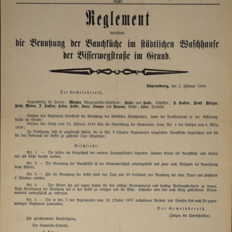 Règlement municipal de la Ville de Luxembourg concernant les équipements de lavage dans le Grund, 1908, Druck von Ch. Braum, parfait état, 43,5 x 35,5 cm
