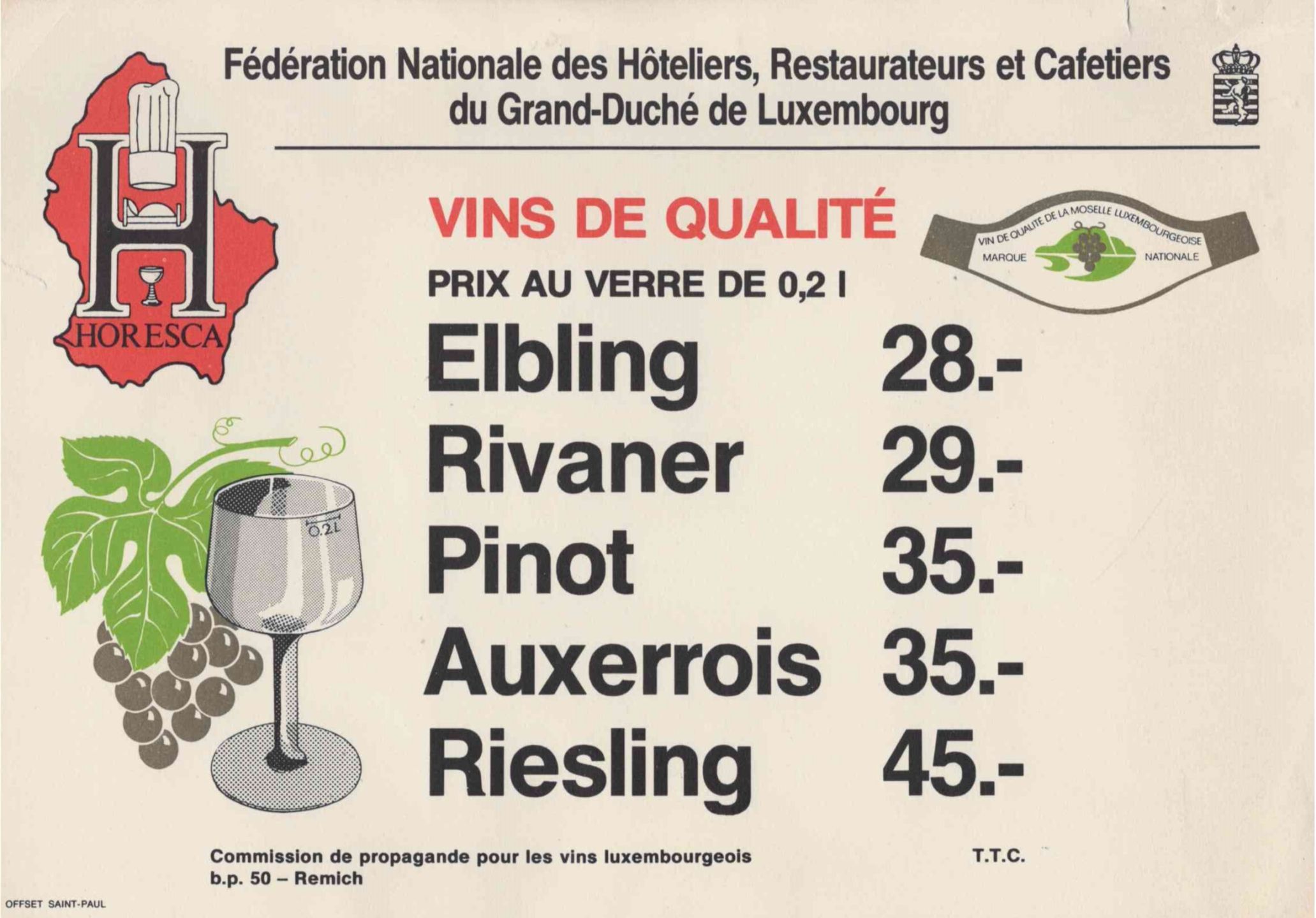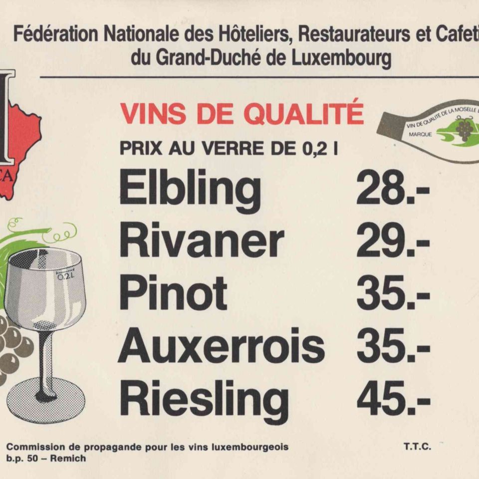 Liste de prix des vins de qualité de la Fédération Nationale des Hôteliers, Restaurateurs et Cafetiers du GDL, document affiché dans les cafés, imprimée chez Saint-Paul, années 50, 21 x 29,5 cm (petite déchirure d'1 cm en bordure gauche)