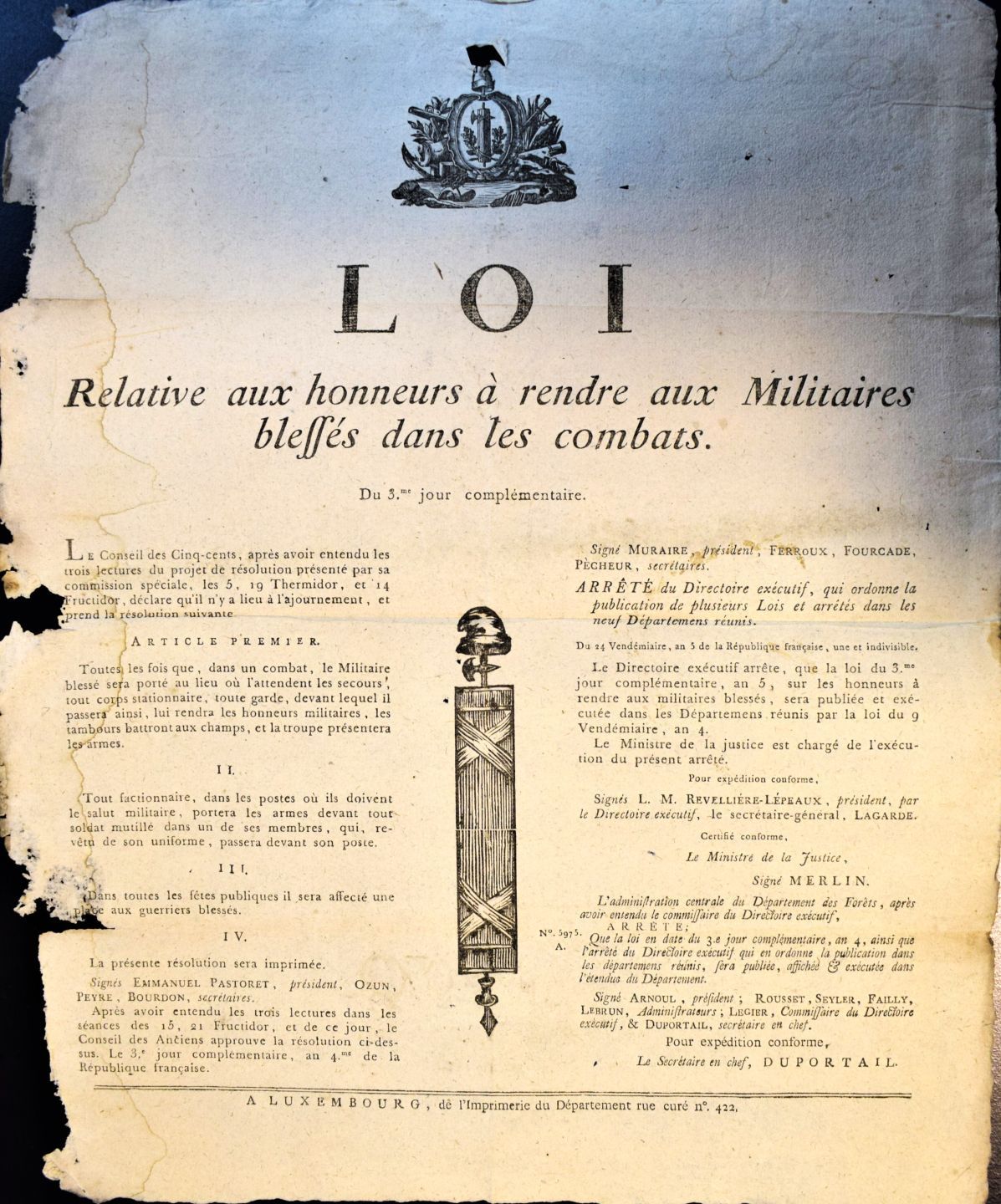 MILITAIRE. LOI Relative aux honneurs à rendre aux Militaires blessés dans les combats, A Luxembourg, de l'Imprimerie du Département Rue Curé.