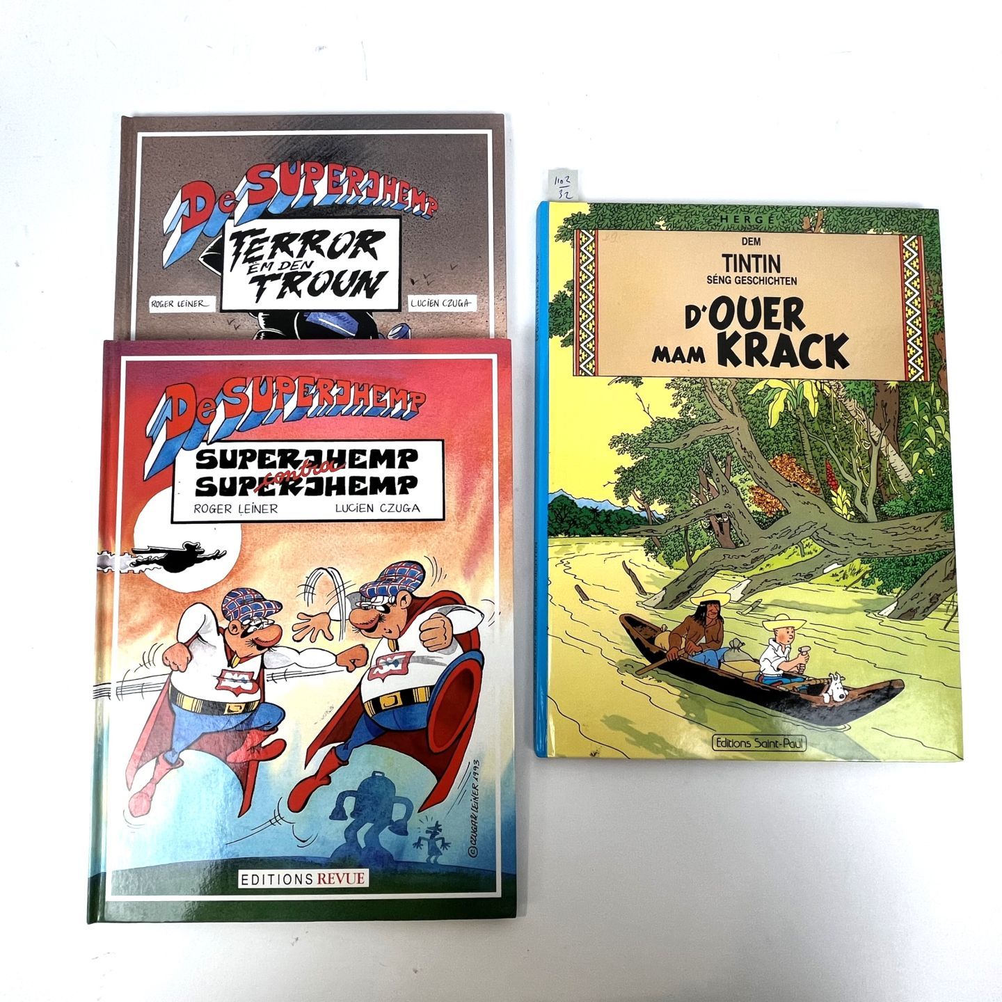Objets de collection : Hergé et deux albums de Superjhemp en excellent état