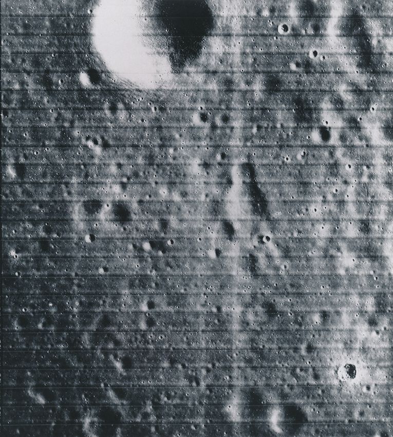 NASA. Vue de la surface lunaire réalisée par la sonde spatiale LUNAR ORBITER. La sonde spatiale LUNAR ORBITER a réalisé dans la première partie des années 60 les premières vues des paysages lunaires mettent en évidence un sol constellé de cratères définissant de superbes compositions plastiques dignes de création artistiques contemporaines; Circa 1965.
