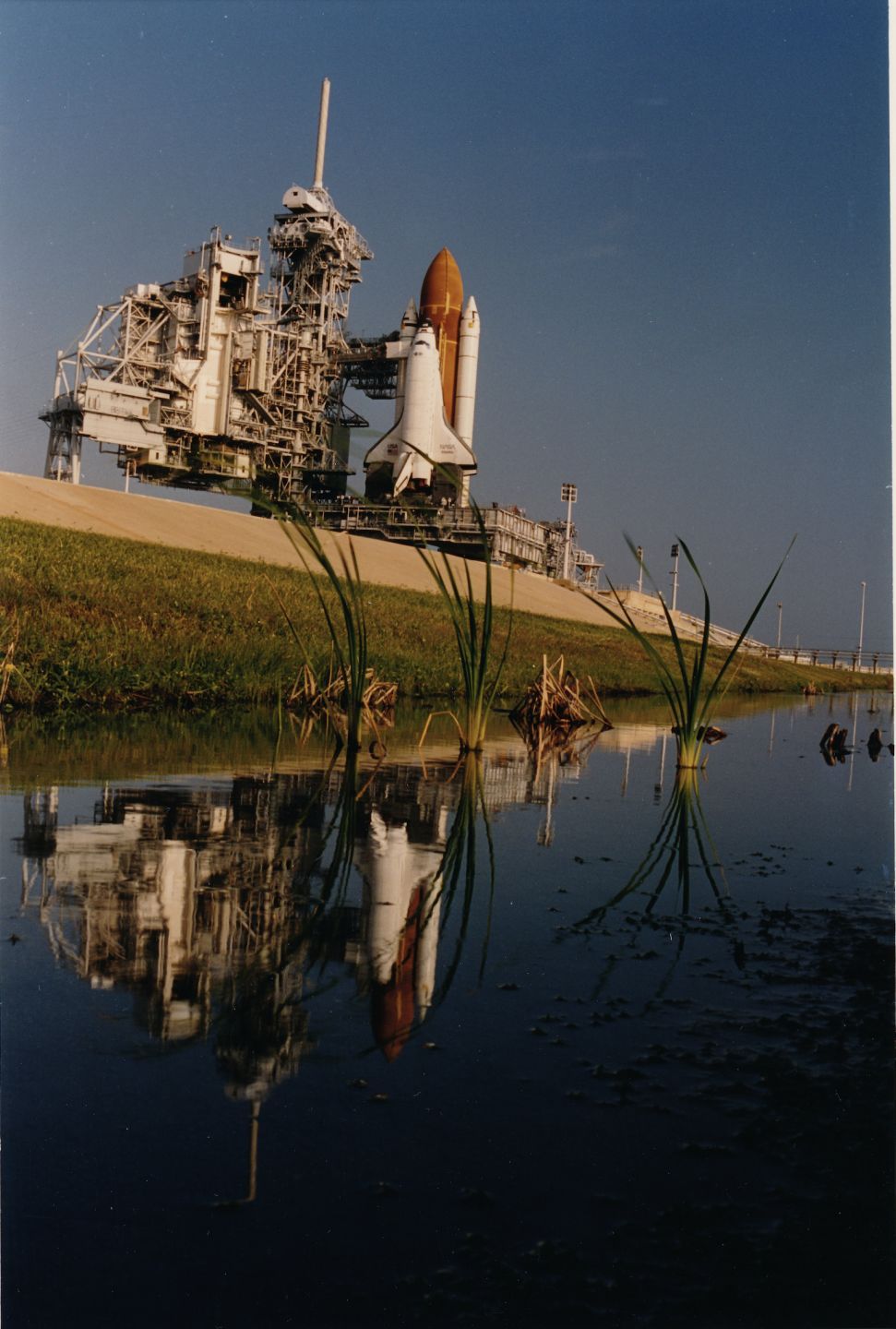 NASA. La navette spatiale ATLANTIS (Mission STS-44) est positionnée au-dessus de la plateforme mobile de lancement 39A suite à un voyage de 6 heures du bâtiment d'assemblement de la navette spatiale. 24 octobre 1991. Tirage chromogénique d’époque sur papier : « THIS PAPER MANUFACTURED BY KODAK ». Logo NASA et légende tapuscrite au dos. 25,2 x 20,3cm avec marges.