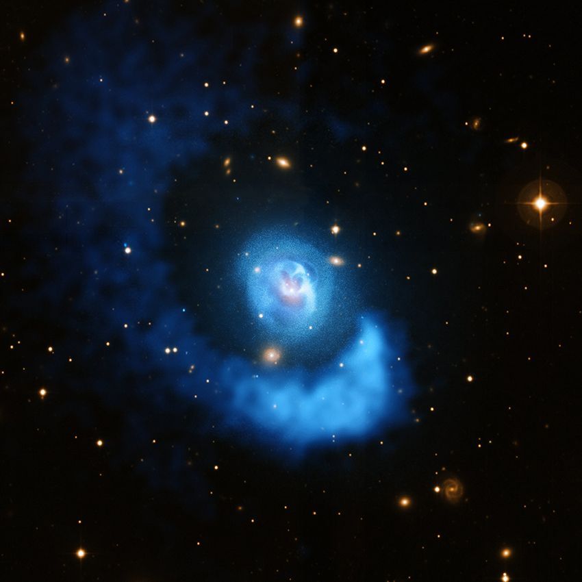 Nasa. GRAND FORMAT. Comme du vin dans un verre, de vastes nuages de gaz chauds se déplacent dans cet amas de galaxies situé à environ 480 millions d'années-lumière de la Terre. Une énorme structure en spirale dans le gaz chaud -- qui s'étend sur près d'un million d'années-lumière -- est visible autour de l'extérieur de l'image, entourant une galaxie elliptique géante au centre. Cette spirale a été créée lorsqu'un petit amas de galaxies s'est écrasé contre une plus grande qui entoure la galaxie elliptique centrale. 2011.