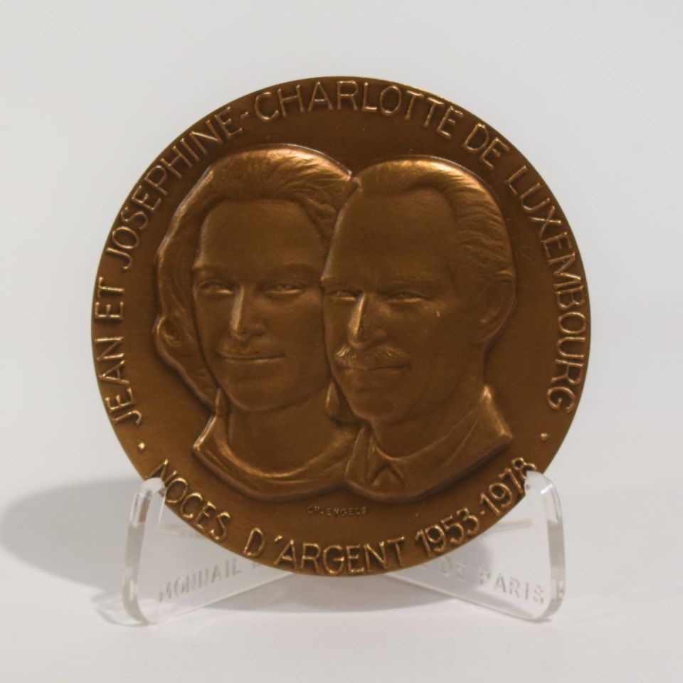 Médaille en bronze commémorant les noces d'argent 1953-1978 de Jean et Joséphine-Charlotte de Luxembourg, dessinée par Charlotte ENGELS (1920-1993) [prix Grand-Duc Adolphe en 1952], chevalet en plexiglas, diamètre 68 mm