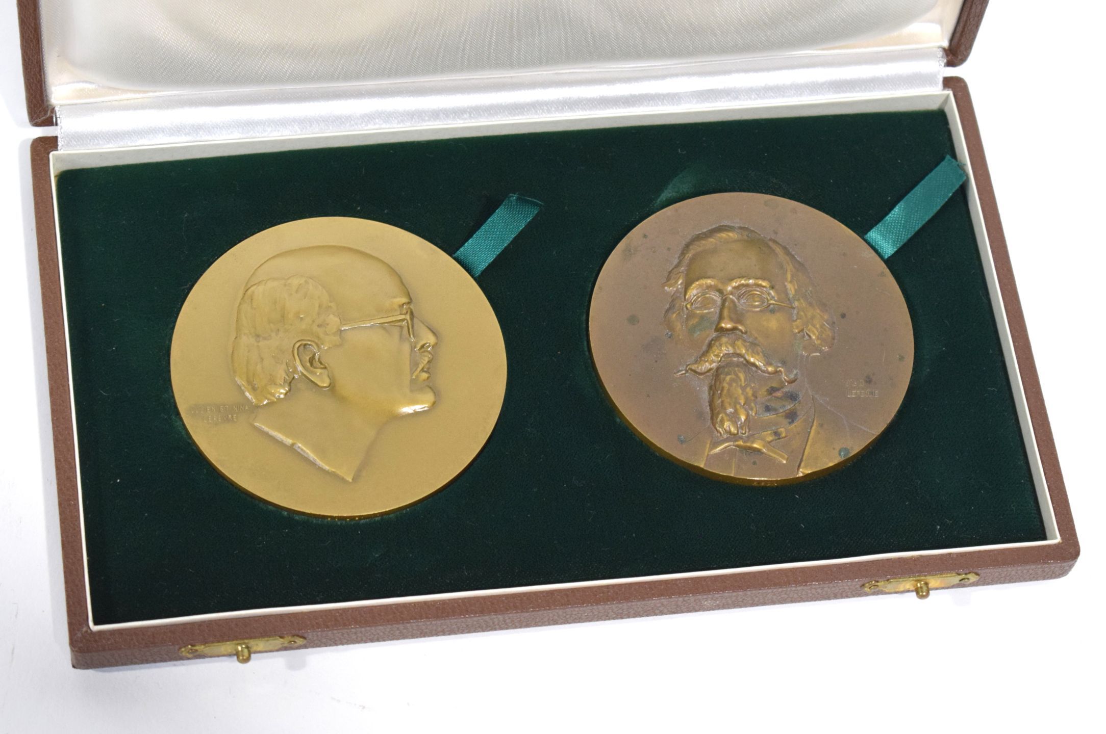 Dans un étui, réunion de 2 médailles en bronze dessinées par Nina et Julien LEFEVRE, à l'atelier Fibru-Fisch de Bruxelles :