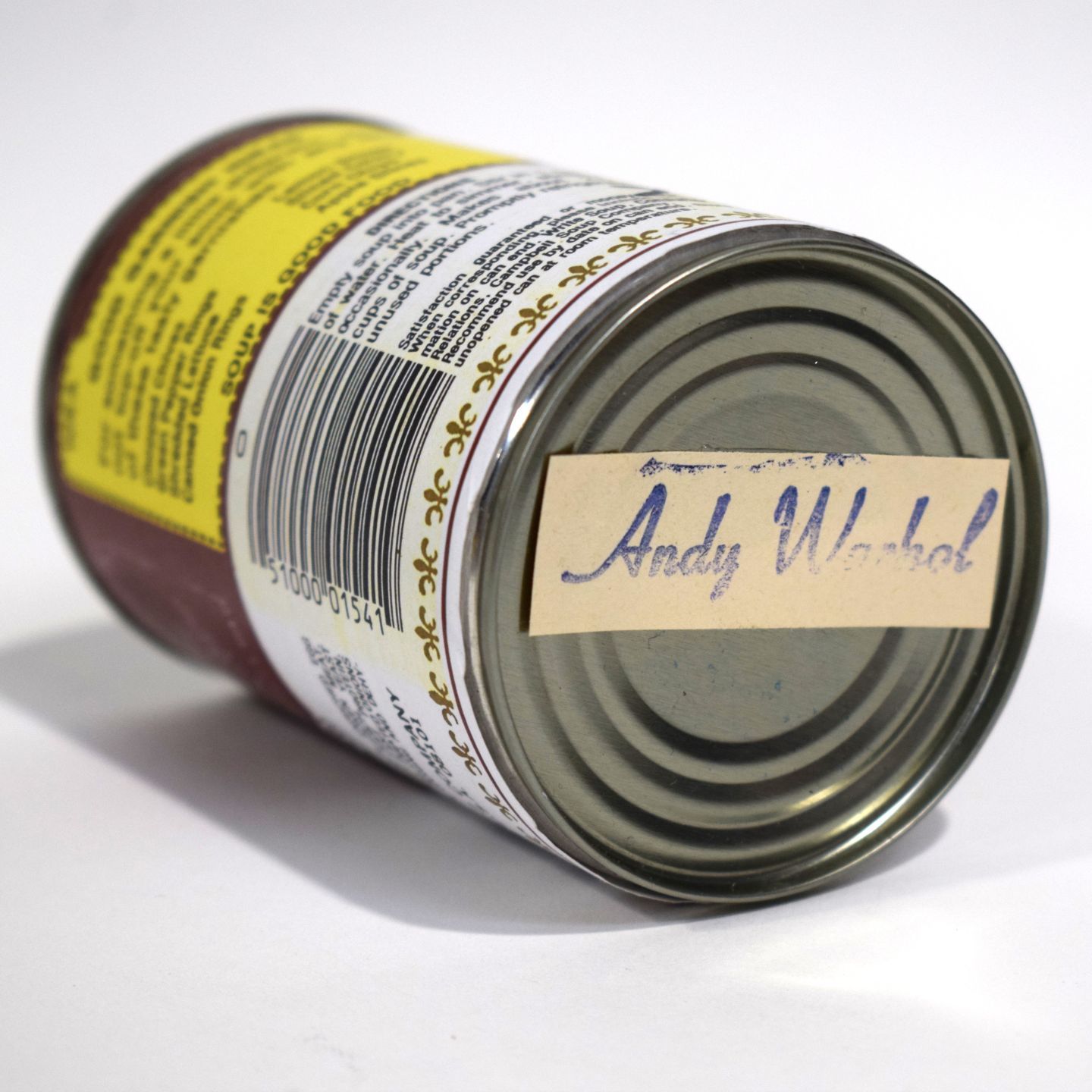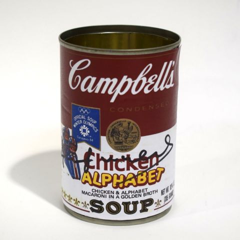 A. Warhol (d'après), Campbell's Chicken Alphabet Soup, Boîte de conserve métallique, porte une signature au feutre sur l'étiquette et deux tampons dessous et à l’intérieur, 10 x 6,7 cm, sans certificat