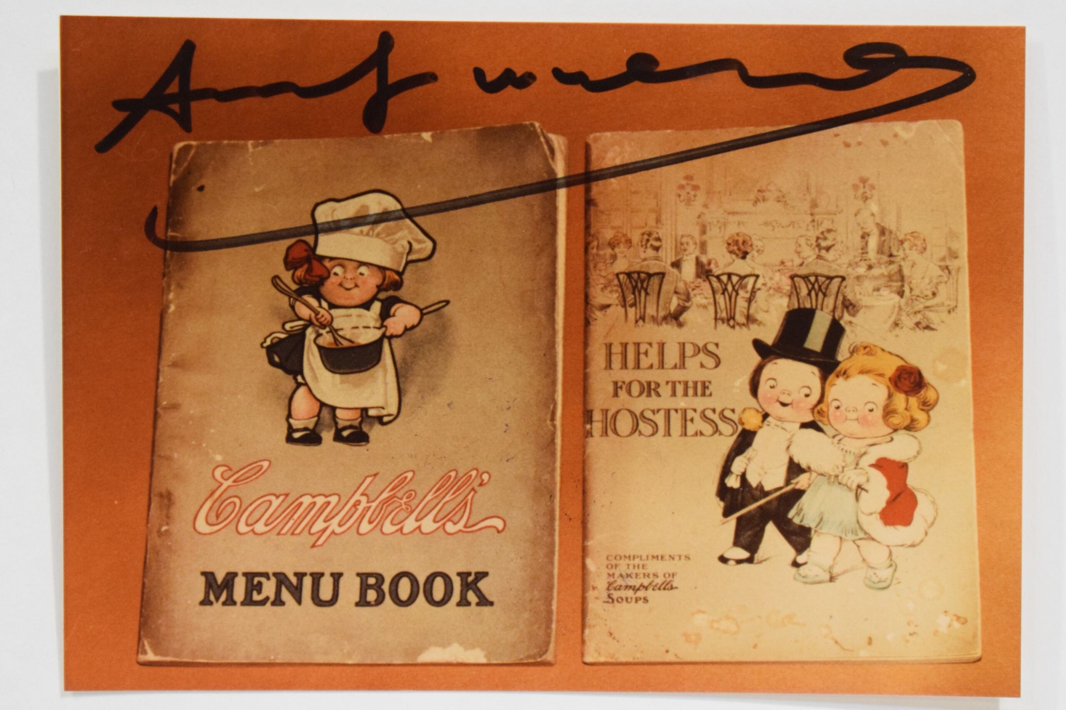 A. Warhol (d'après), Campbells Menu Book, Tirage photographique, porte une signature au feutre noir en bas, justifiée 0006266 & 2 tampons AW & annotations & tampon Interview, 12,5 x 9 cm,