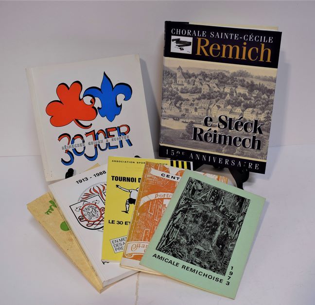 (Moselle/Remich) 1. Lëtzebuerger Guiden a Scouten St. Cunibert Réimech : 30-Joer-Feier a Fändelwei, 18. November 1995. 2. 25ème anniversaire des Anciens de l'Ecole de Viticulture : Remich, 1982. 3. 75 Joër Pompjeeskantonalverband Réimech a Kantonaldag 1988 zu Réimech, 14. et 15. Mä 1988. 4. Programme, Amicale Remichoise, 1973. 5. Harmonie Municipale Concordia Remich : Centenaire 1875-1975, 1975. 6. Association sportive Remich : Tournoi de Paques, le 30 et 31 mars 1986. 7. Chorale Sainte-Cecile Remich : E Stéck Réimech, 150e anniversaire, 1848-1998, 1998. 8.