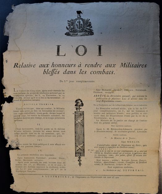 LOI Relative aux honneurs à rendre aux Militaires blessés dans les combats, A Luxembourg, de l'Imprimerie du Département Rue Curé, 42 x 35 cm