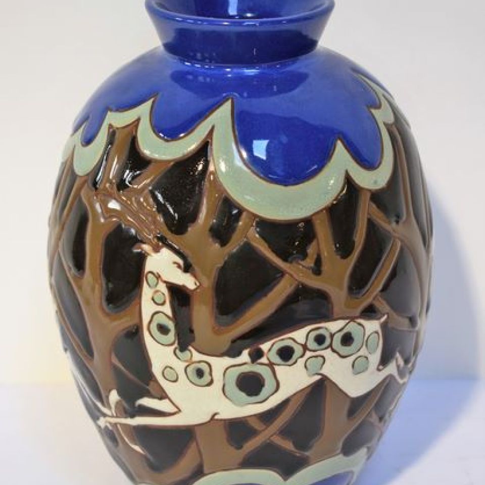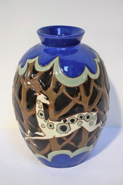 VILLEROY & BOCH - Rare vase. Décor de gazelles en forêt. Années 20/30. Forme 303. 27 x 18,5 cm.