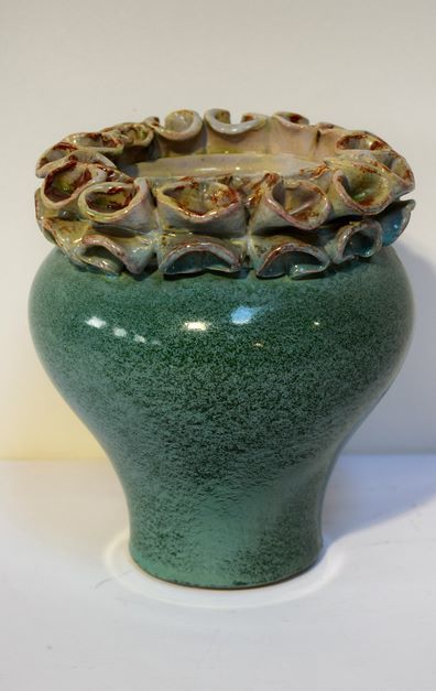 Léon NOSBUCH (1897-1979), Potier, Vase en faïence vert d'eau tacheté. Bordure à tubes écrasés. Signé sur la base "J. L. NOSBUCH 1969". Bon état. 17 cm x 16 cm.