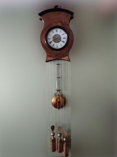 PENDULE MURALE luxembourgeoise de forme demi-lune à trois poids. Carillon à trois + deux cloches, coffrage en noyer et placage de noyer, 2 soufflets d'ouverture latéraux. Cadran en porcelaine recouvert d'un verre circulaire, chiffres romains, balancier, Cerclage hublot en bois noirci. Mention "A STRAUSS BETTBORN 1853". 65 x 46 cm