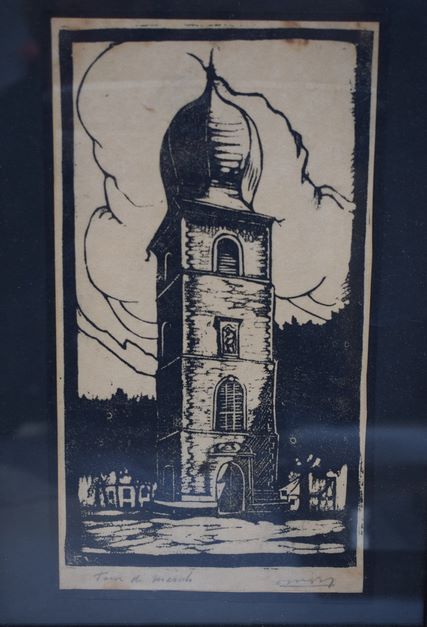 Clocher de l'ancienne église de Michaelsplatz à Mersch, Bois gravé signé E.W. dans la planche et en bas à droite, 25 x 14 cm + Dessin signé en bas à droite "Luxembourg, Le Marché aux poissons", daté 1959, 16 x 24 cm