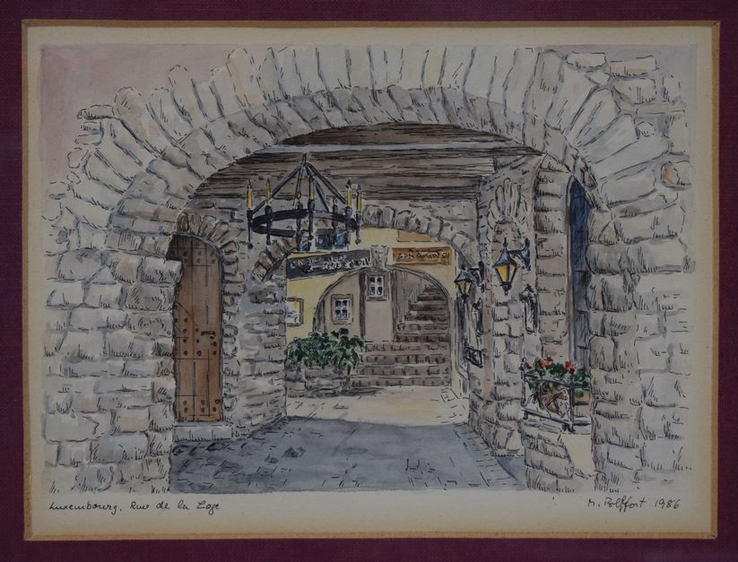 Dessin aquarellé "Luxembourg, Rue de la Loge", signé en bas à droite M. Polffort et daté 1986