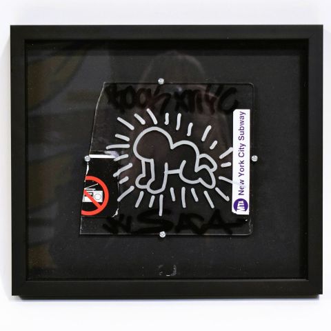 K. Haring (d'après), Haring Baby, Demi-Plaque plexiglas New York City Subway, Dessin au feutre argent et noir 18 x 16 cm à vue, encadré, 32,5 x 28 cm.