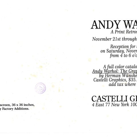 A. Warhol (d'après), Marelyn Monroe (violet). Carton d'invitation pour exposition, Impression en couleur sur papier texturé par Castelli Graphics New York, porte une signature au marqueur noir à gauche. Tampon A.W et Andy Warhol Selection.