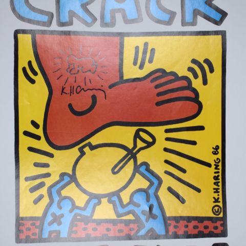 K. Haring (d'après), Crack Down, Impression sur papier lisse. Porte une signature au centre. 48 x 33 cm Tampon au verso "Pop Shop, 292 LaFayette, St.NYC 10012".