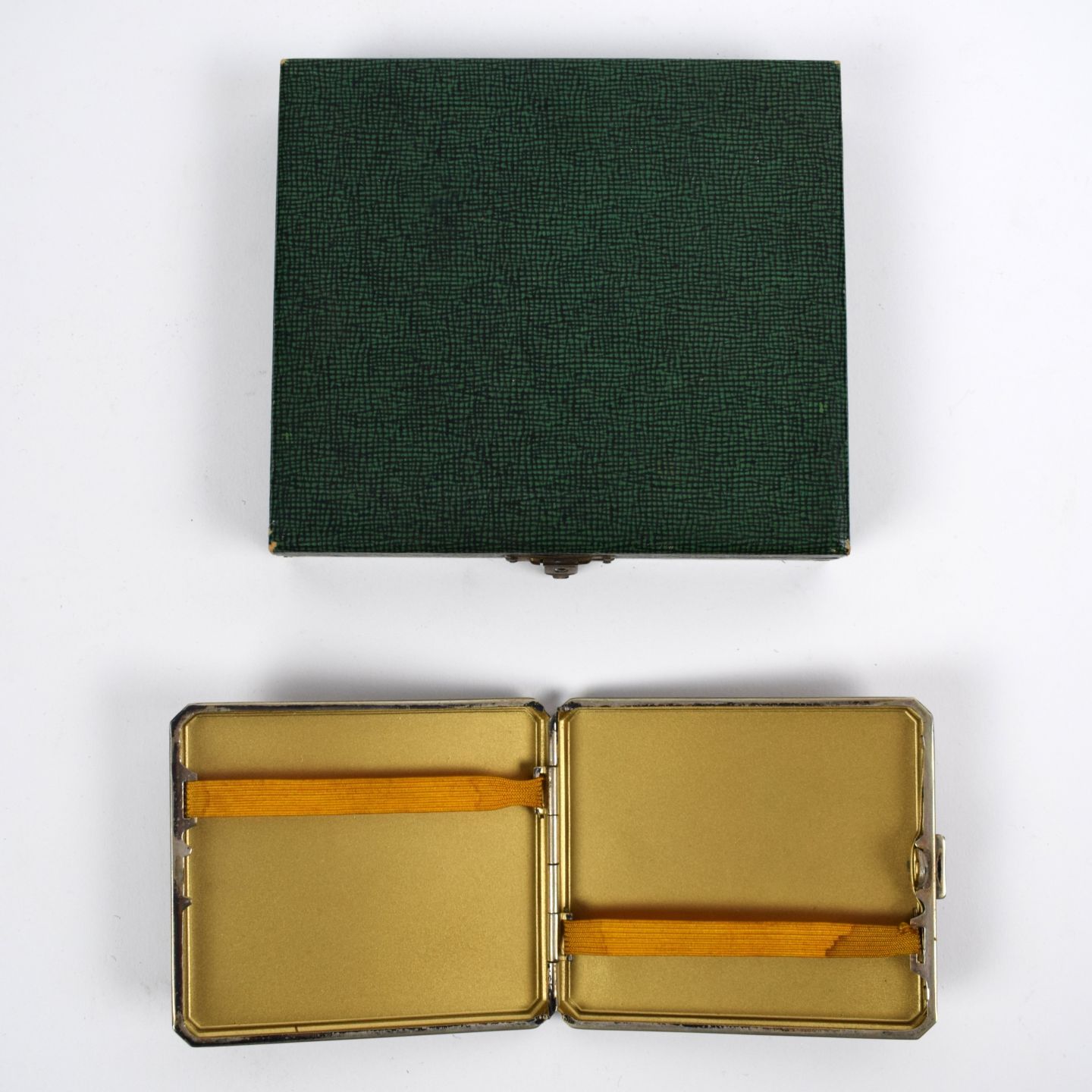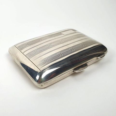 ETUI à cigarettes en métal argenté, monogrammé MR. Dans sa boîte de rangement. Années 50. 8 x 9 cm